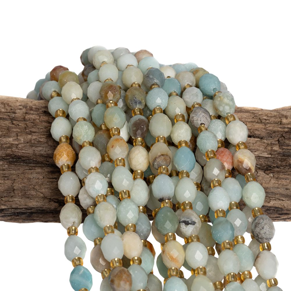 - Amazonit oliva gyöngyök 6x8 mm félhosszú zsinór