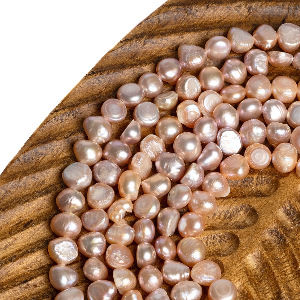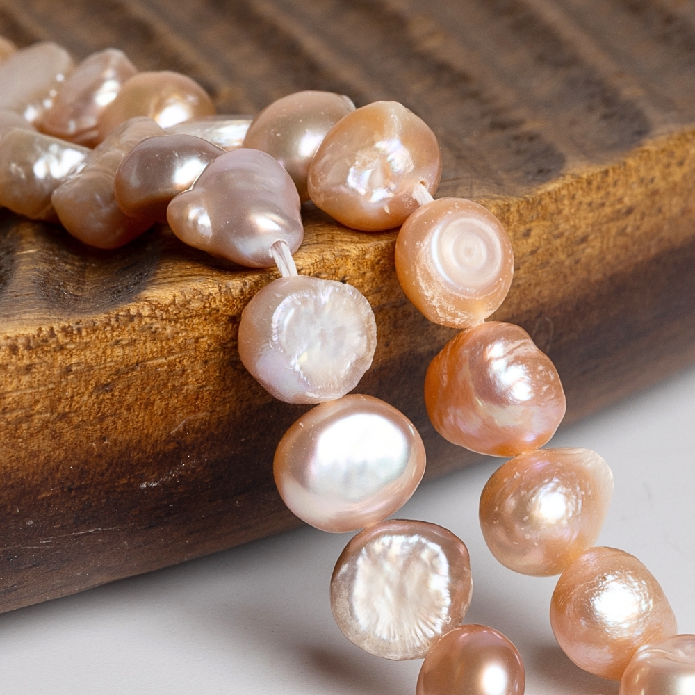 Gyönyörű szabálytalan gyöngyök egyik oldalukon lapos felülettel, rózsaszín-lazac irizáló színben.