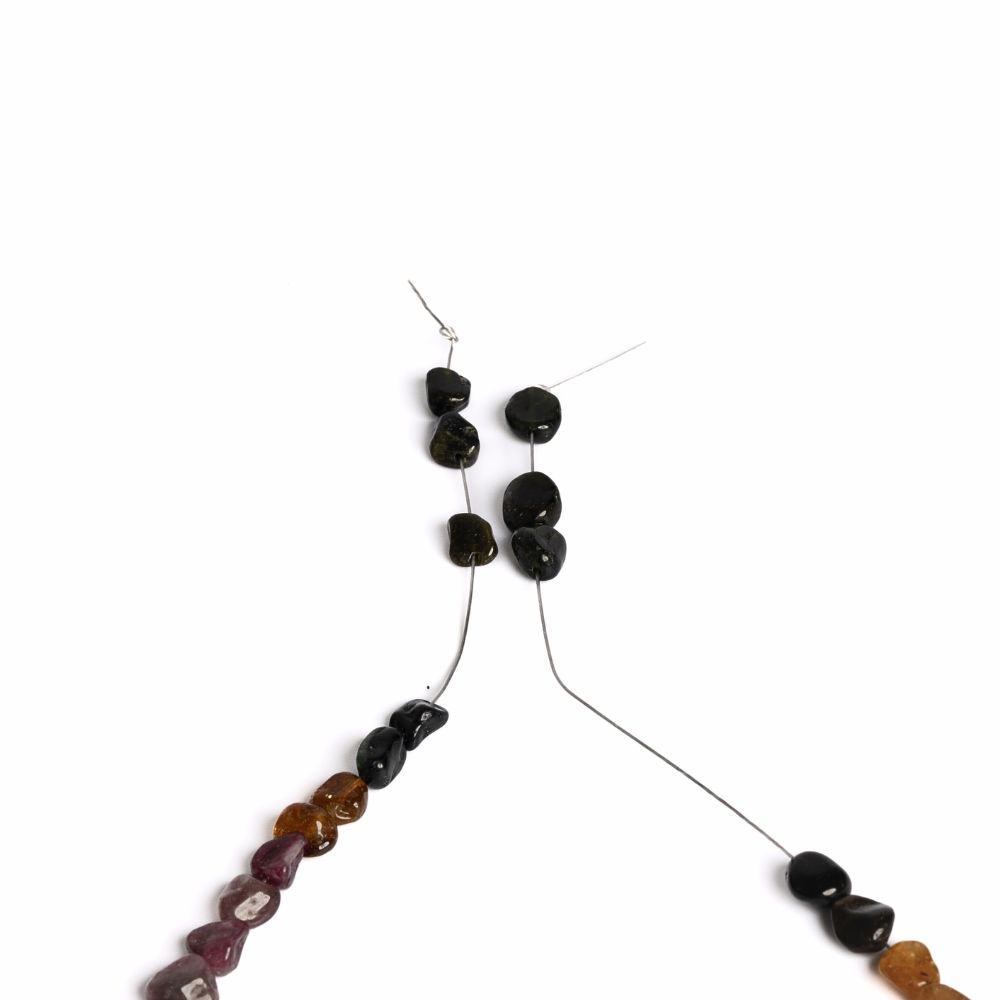 Természetes turmalinból készült nugget gyöngyök – műanyag bevonatú drótra fűzve.