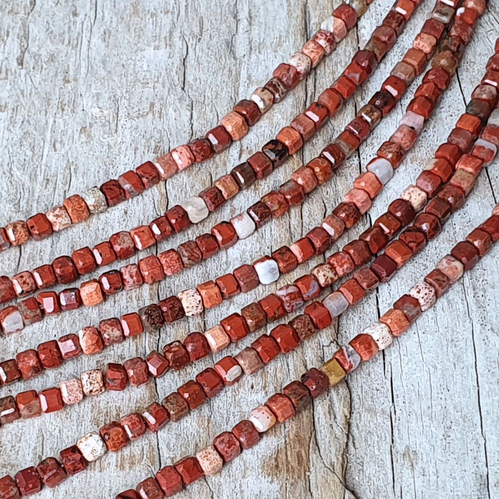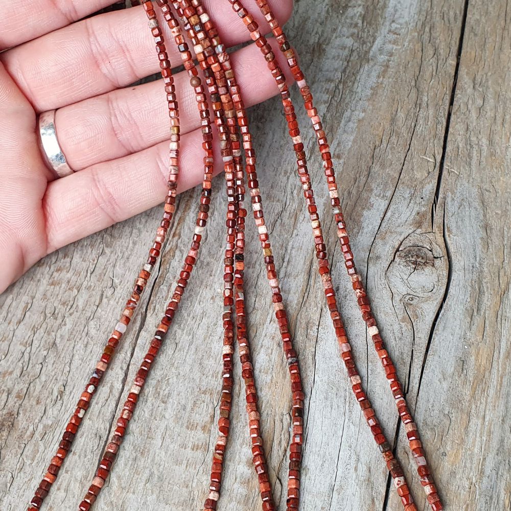 Piros jáspis gyöngyök 2,5 mm csiszolt kockák félhoszú zsinór
