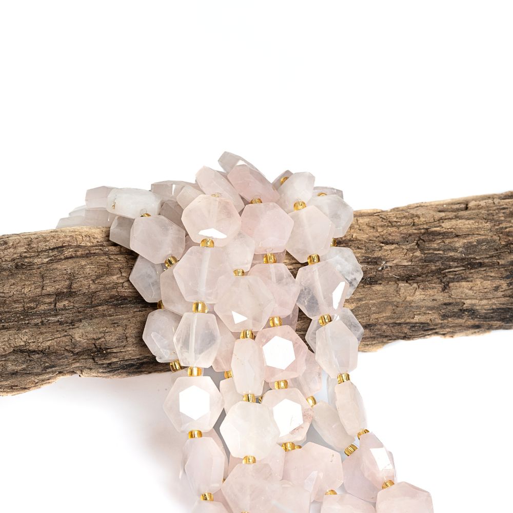 Rózsakvarc gyöngyök 12 mm hatszögek csiszolt félhosszú zsinór